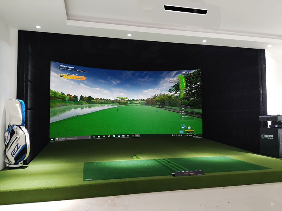 打球过程中,高尔夫球打到幕布上。表面一层为投影幕布,双层加固,更有效防止弹球,增长幕布使用寿命 |